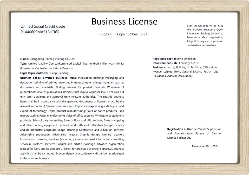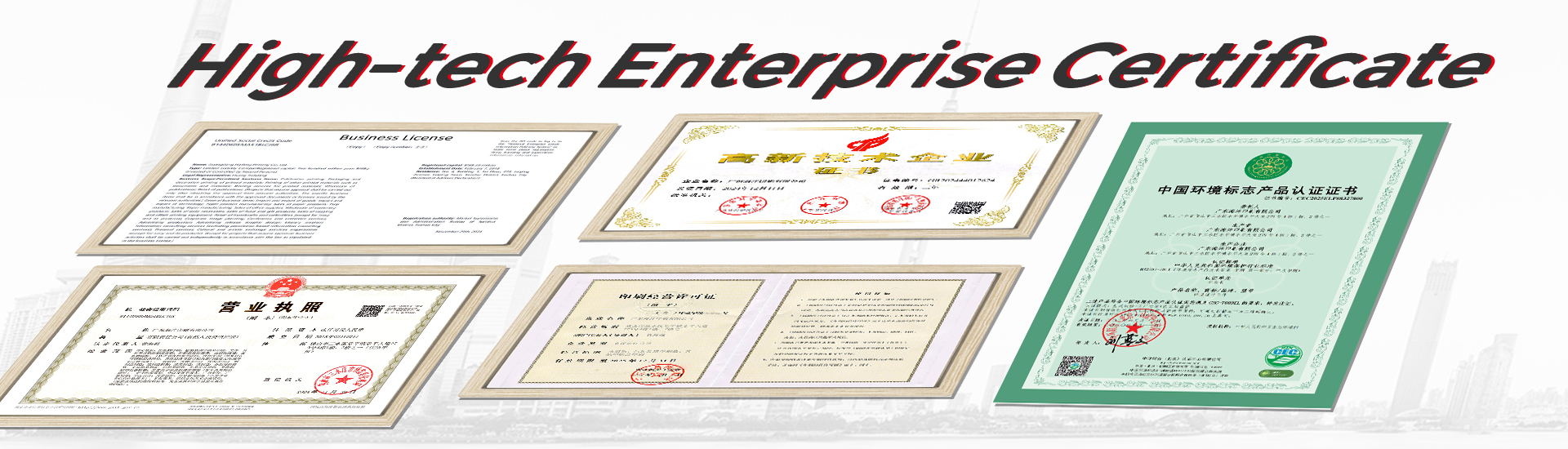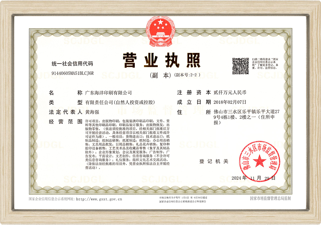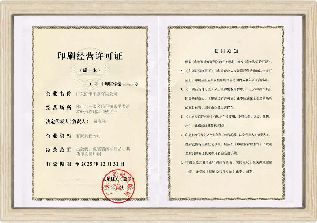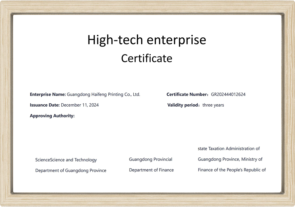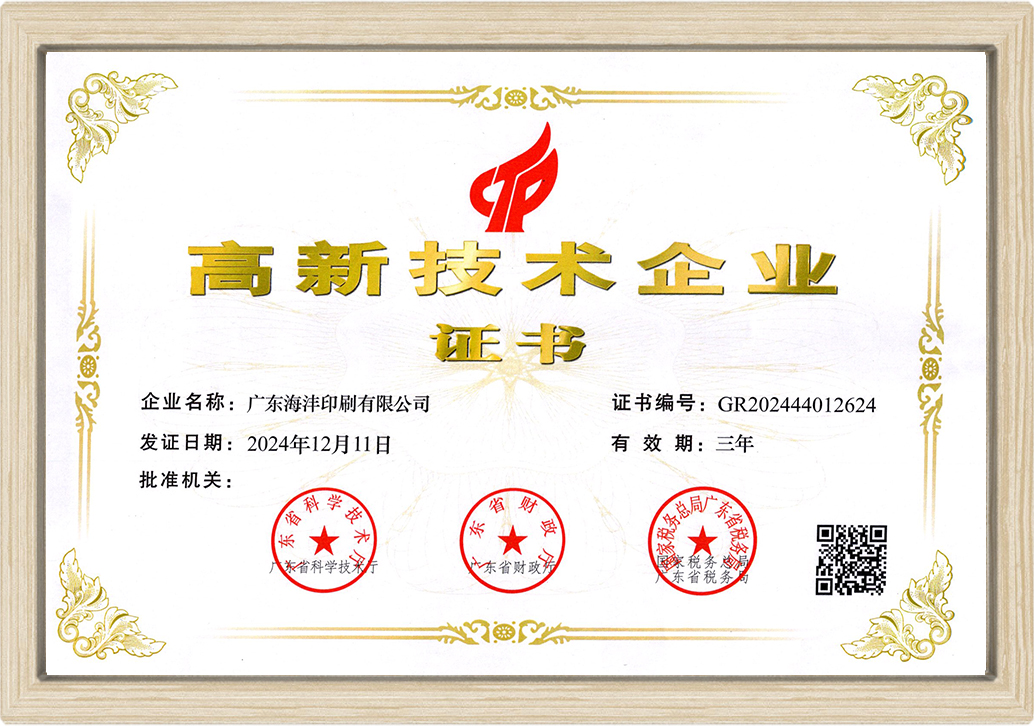 The company is a national high-tech enterprise and a large-scale industrial enterprise in Guangdong Province. It has obtained the printing operation license for publications, packaging and decoration printing products, and other printing products, as well as the China Environmental Label Product Certification, ISO9001 Quality Management System Certification, ISO14001 Environmental Management System Certification, and ISO45001 Occupational Health and Safety Management System Certification. It is also a designated printing supplier for the Guangdong Provincial Government and the Foshan Municipal Government, and a "Contract-abiding and Creditworthy" enterprise in Guangdong Province.