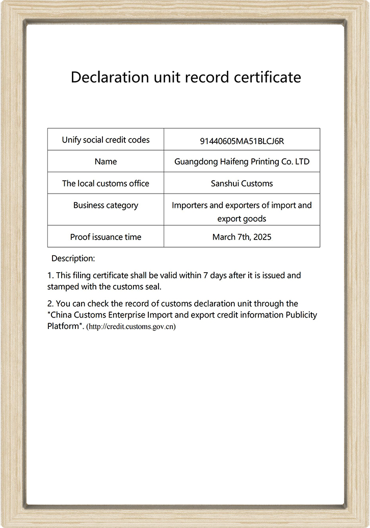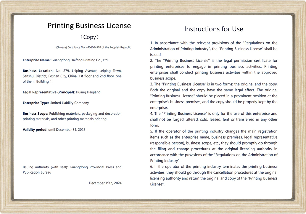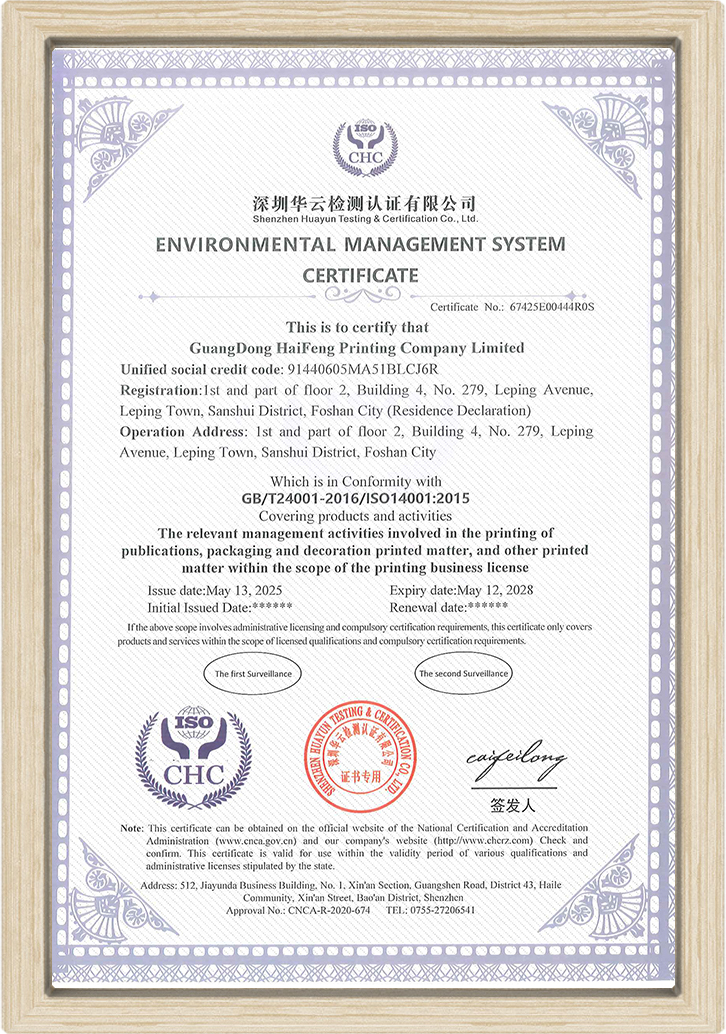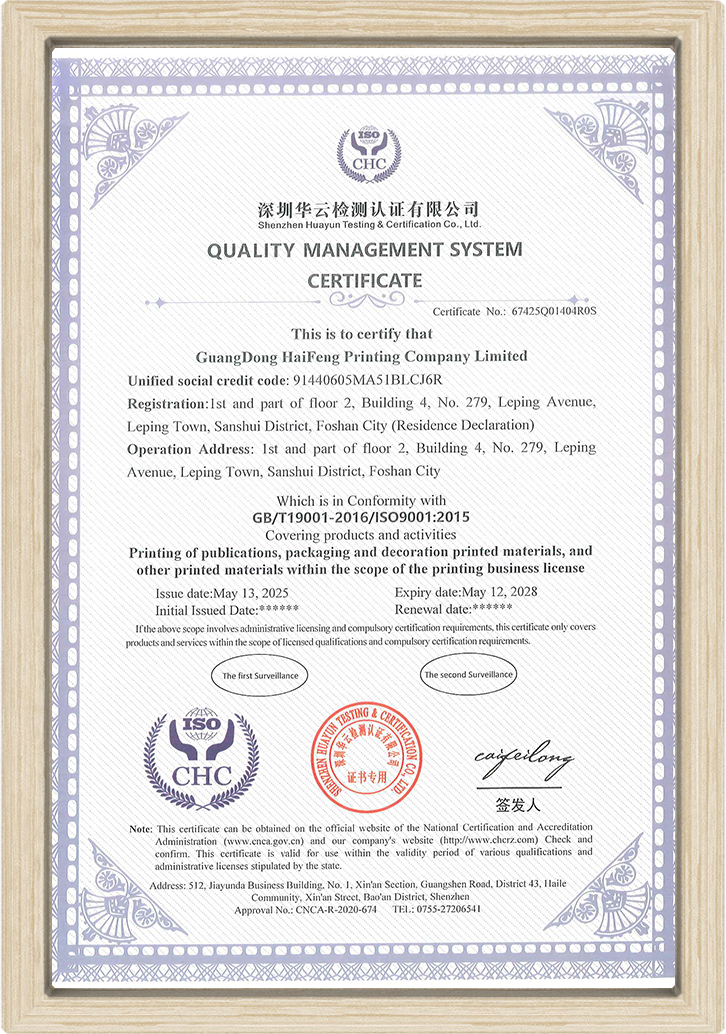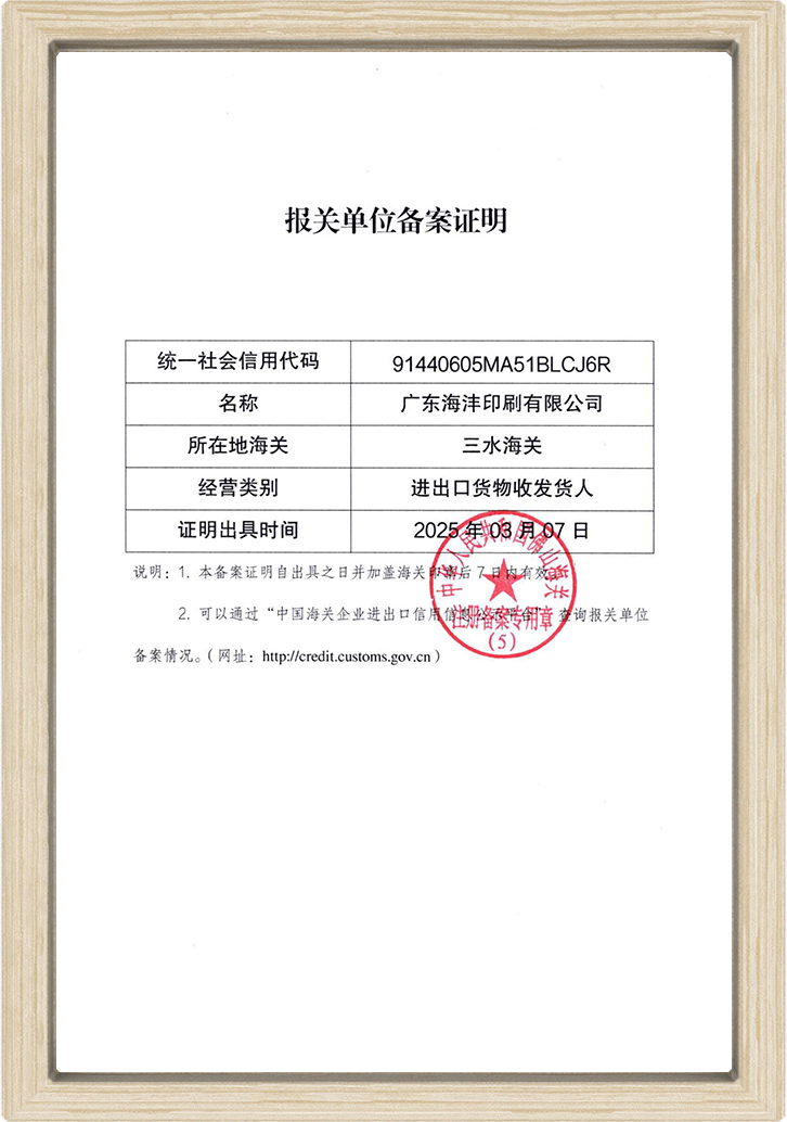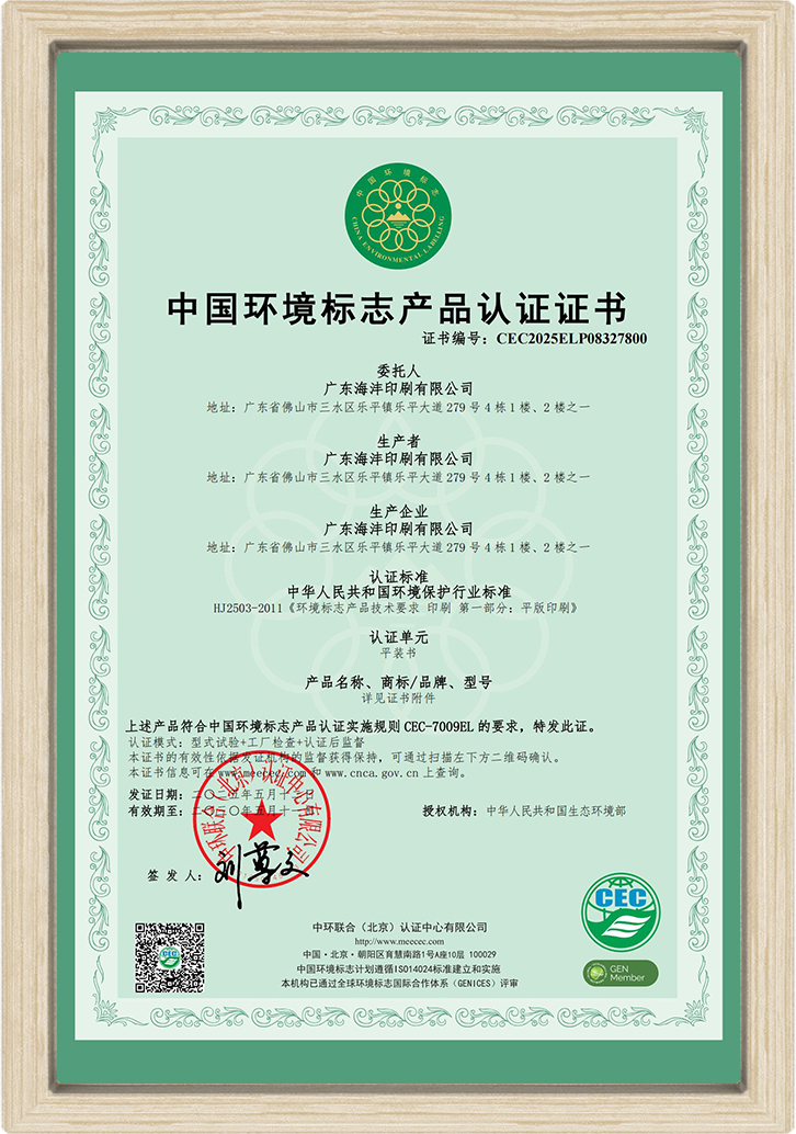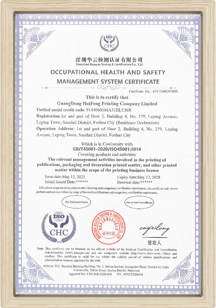 The company is a national high-tech enterprise and a large-scale industrial enterprise in Guangdong Province. It has obtained the printing operation license for publications, packaging and decoration printing products, and other printing products, as well as the China Environmental Label Product Certification, ISO9001 Quality Management System Certification, ISO14001 Environmental Management System Certification, and ISO45001 Occupational Health and Safety Management System Certification. It is also a designated printing supplier for the Guangdong Provincial Government and the Foshan Municipal Government, and a "Contract-abiding and Creditworthy" enterprise in Guangdong Province.